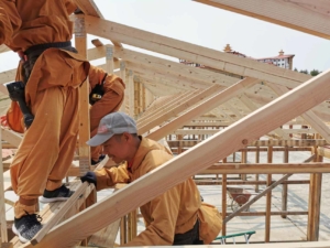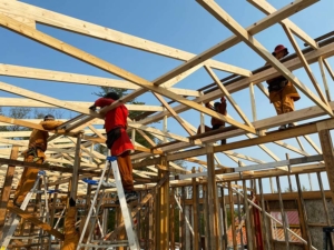 最近,圣山二众在上师的指挥下,开始改建多年的多功能木屋群,最后要把52个、每个大约80磅重的大金字架托上顶。我有幸参与了这次上顶工程,见证了4、5个小组的合作和协调,有条不紊地将的金字架上到房屋顶部,完成房顶结构。