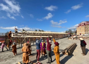 但由于旧的结构有高低不平的地方,负责工程设计的妙禅,不得不在一些旧木头上施行一些“手术”,来保证金字架组的水平。没想到紫光上师发现了这个手术后,慈悲地加持了妙禅,因为其中蕴藏着一道风水法。最后让妙禅感到惊讶不已的是,不可能的事情发生了,那些需要继续动手术的地方都消失了,也就是“自动”水平了。之后的整体工程以原先上师不在场时2倍的速度进行,顺畅度一流!