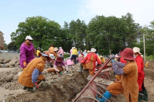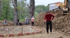 顽石们有的散落在地上,需要不停地弯腰拾取。有的埋在土中,需要挖掘撬动。有的沉重无比,需要艰难搬动,更有的不得不动用挖土机才能移走。当这些石头到达池边时,已有一群人正在等待搬运,另一些人已在泥水中池壁上安放着这些石头。装车运回是艰难的,卸车摆放也不会有一丝的轻松。就是这样的工作量,这群特殊的人安然地做着,这是为什么呢?