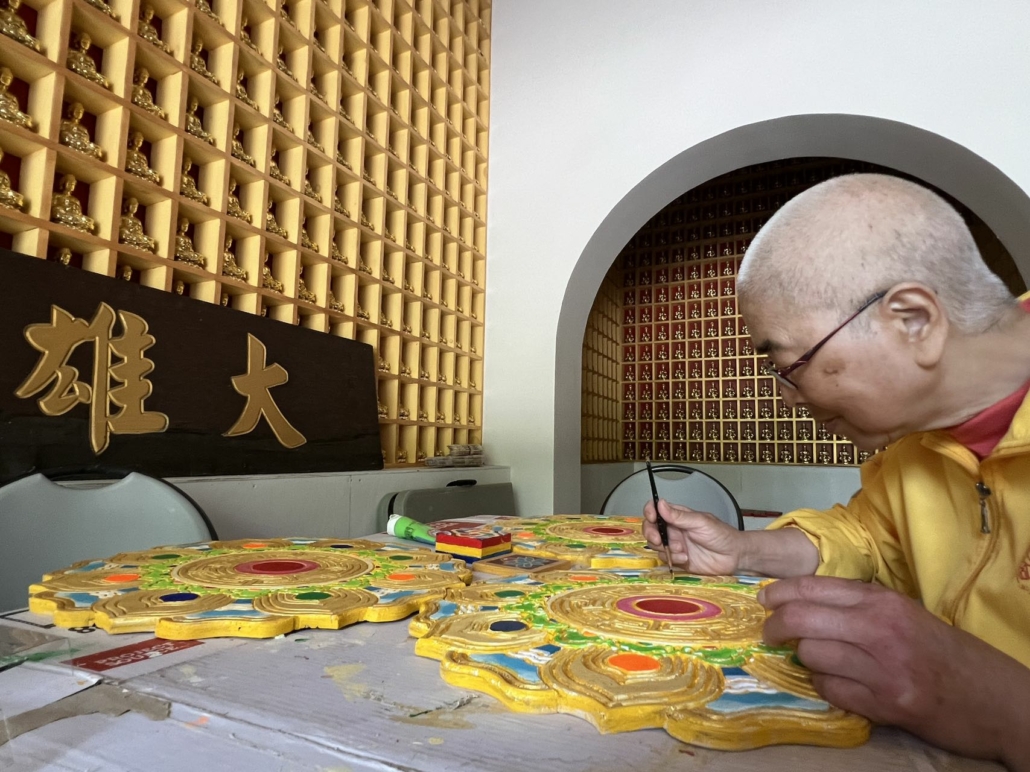 今年76岁的乔奶奶参加了2024年5月至6月的一、二乘大圆满密法培训班。学习结束后,她主动留在圣山做义工,分配到的工作是给木刻佛盘上色。一开始乔奶奶心里很紧张,她害怕自己手颤,线描不直,涂色不均。她在心里不断请求紫光上师加持。
