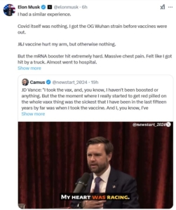 马斯克转发了这采访视频:“新冠本身对我来说没什么。我在疫苗推出之前就感染了最早的毒株。强生疫苗让我手臂疼了一下,但除此之外没什么影响。但 mRNA 加强针给我非常激烈的反应,胸痛剧烈,感觉像被卡车撞了,差点去了医院。”